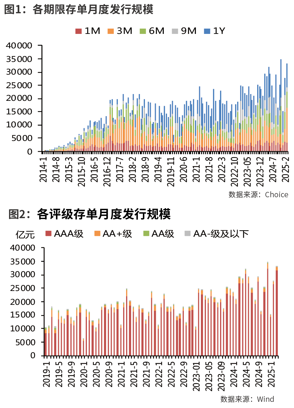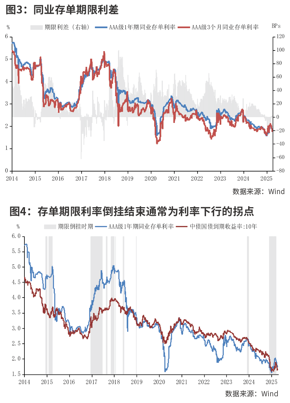 本轮同业存单期限利率倒挂自2024年12月上旬起,至2025年3月中旬基本结束,共持续逾3个月。自同业存单创立以来,共出现8次期限利差持续为负的阶段,时间点多出现在年末、年初以及季末,持续时间通常在一个半月以内,主要原因为短期银行流动性缺口较大,长期资金利率预期则仍宽松,从而导致短期限存单收益率明显上行超过长端收益率。但当有较大的政策变动时,同业存单期限利率倒挂时间通常更长、倒挂节点也会出现在非年末时期。通过观察可以发现,同业存单期限利率倒挂结束通常为AAA级1年期存单收益率、10年期国债收益率下行的拐点。